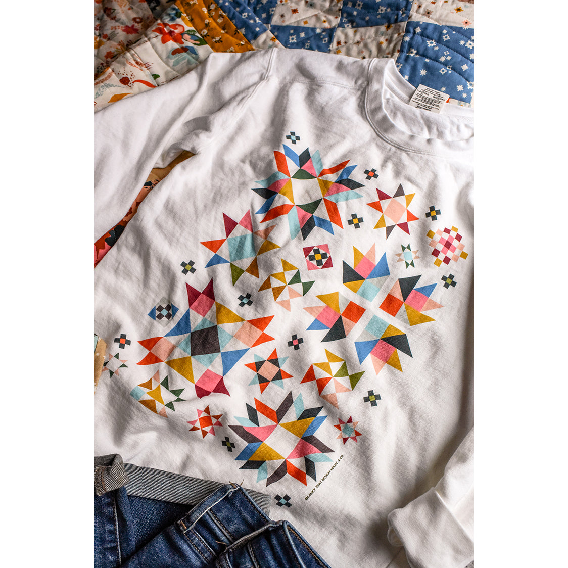 The colorful quilt block sweatshirt is like a thrifted gem, but better. It provides a soft, worn-in feel, vintage-washed colors, and a relaxed fit—ideal for everyday wear and offered on multiple colors!