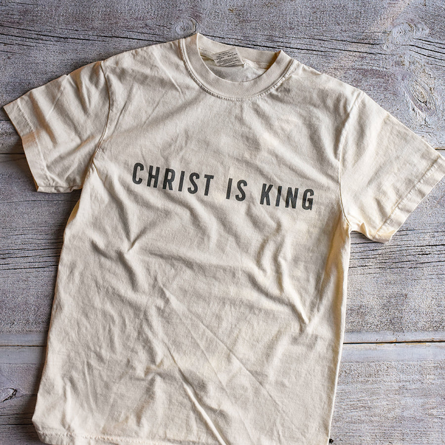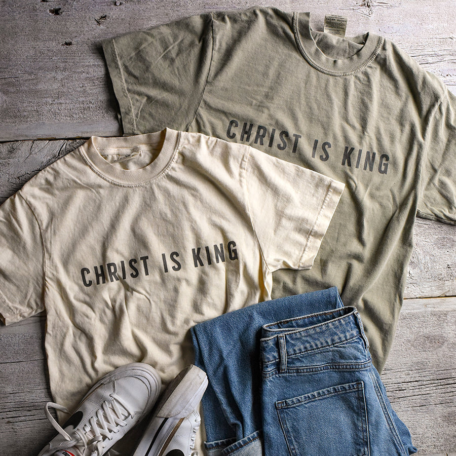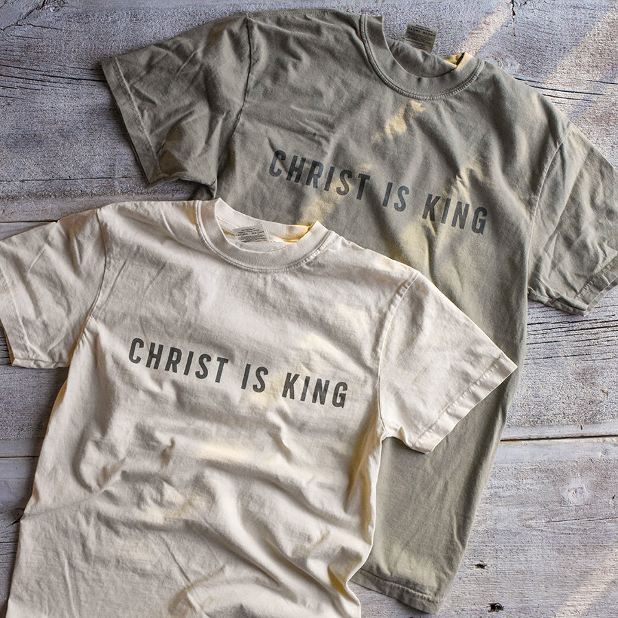Christ is King dark charcoal print on a Comfort Colors tee.
